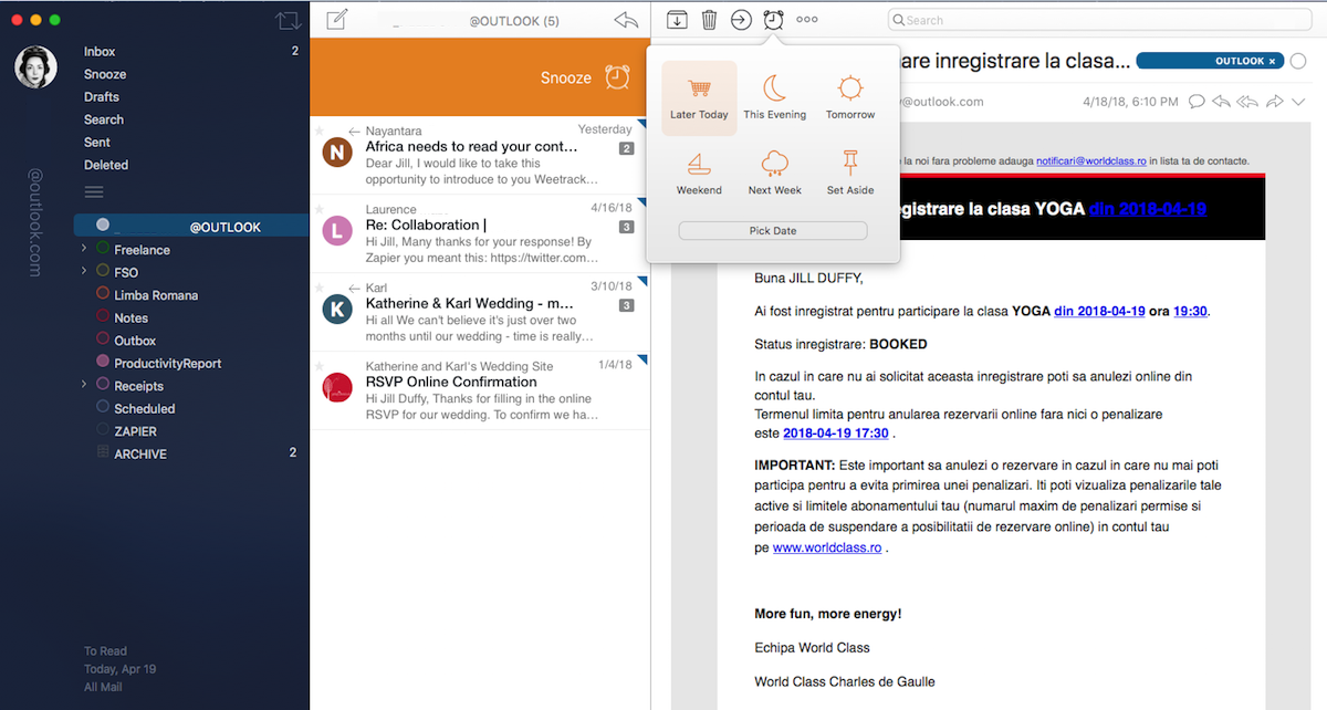 Polymail's strong suit is that you can use it collaboratively, especially among sales teams. Create email templates, for example, and you can share them with everyone on a team. For groups that use Salesforce, you can connect the two apps and get information you need from Salesforce while writing messages. Teams can also track email stats together to see how much time everyone spends in their inboxes, or how likely each person is to get a reply. Another great feature is Polymail's ability to watch and report back when recipients open your messages, and who among them downloads attachments you send. You'll also notice that Polymail is packed with features, everything from the ability to snooze a message until later to an undo send button.